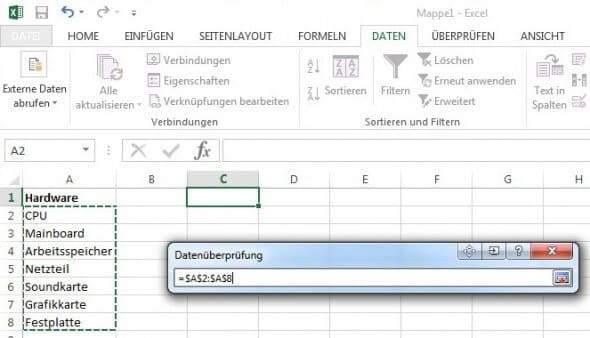 Nun muss Excel wissen woher die Auswahl für die Dropdownliste genommen wird.